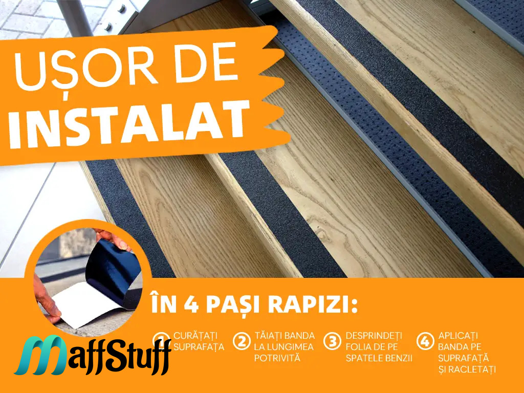 Nu, montajul este simplu și rapid. Tai banda la dimensiunea dorită, îndepărtezi folia de protecție și o aplici direct pe treaptă. Nu ai nevoie de unelte speciale sau experiență.