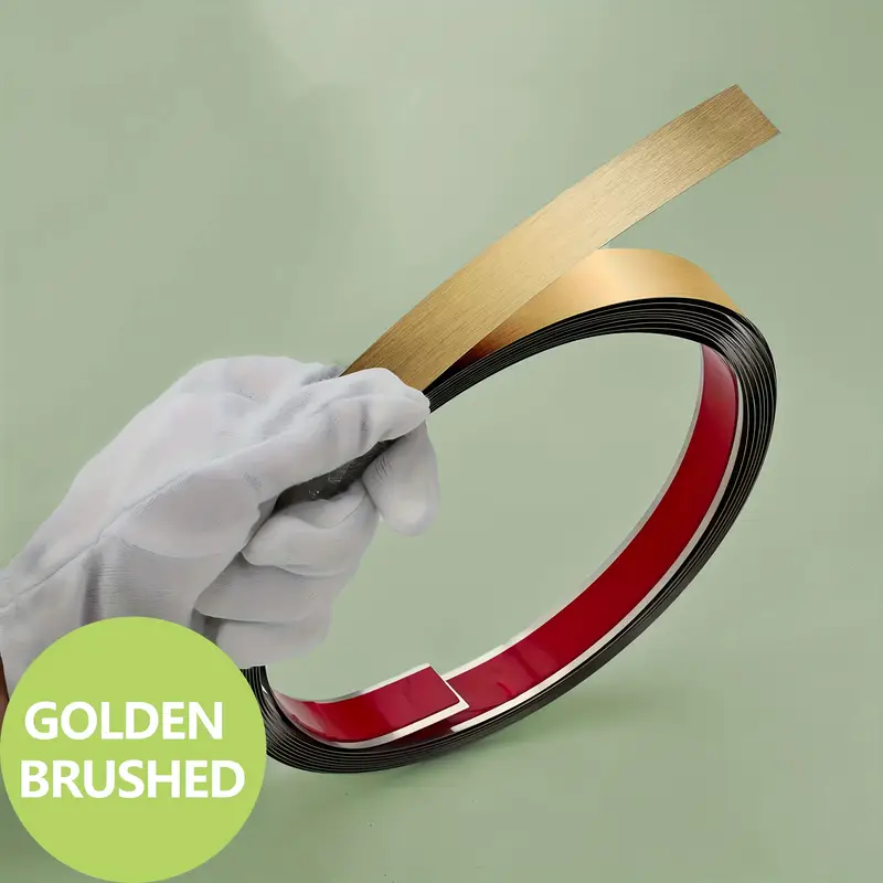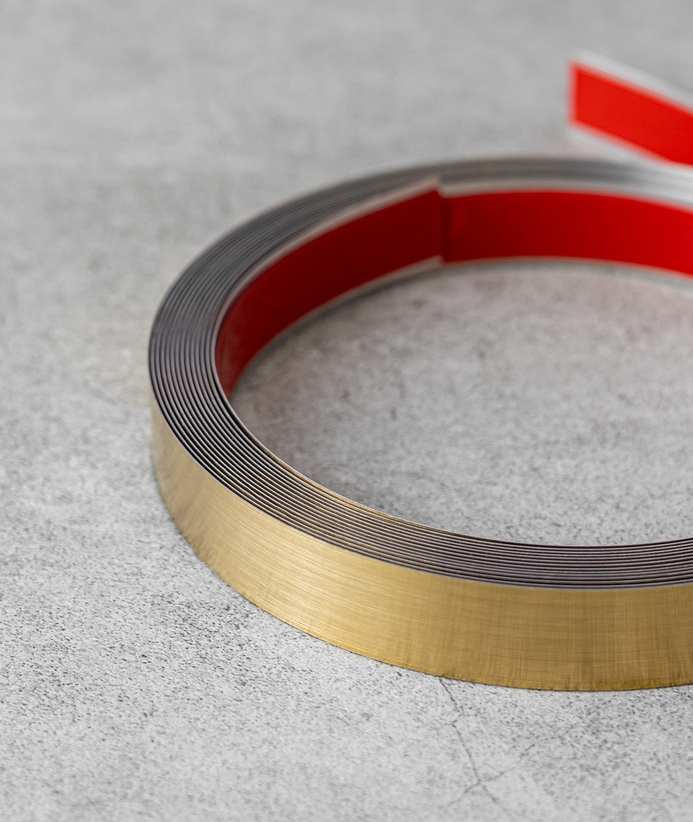 Este o bandă metalică flexibilă realizată din oțel inoxidabil nichelat cu finisaj auriu mat periat, folosită pentru decorarea pereților, mobilierului, oglinzilor și muchiilor. Are spate autoadeziv puternic și strat protector PVD care o face rezistentă la apă, coroziune și zgârieturi.