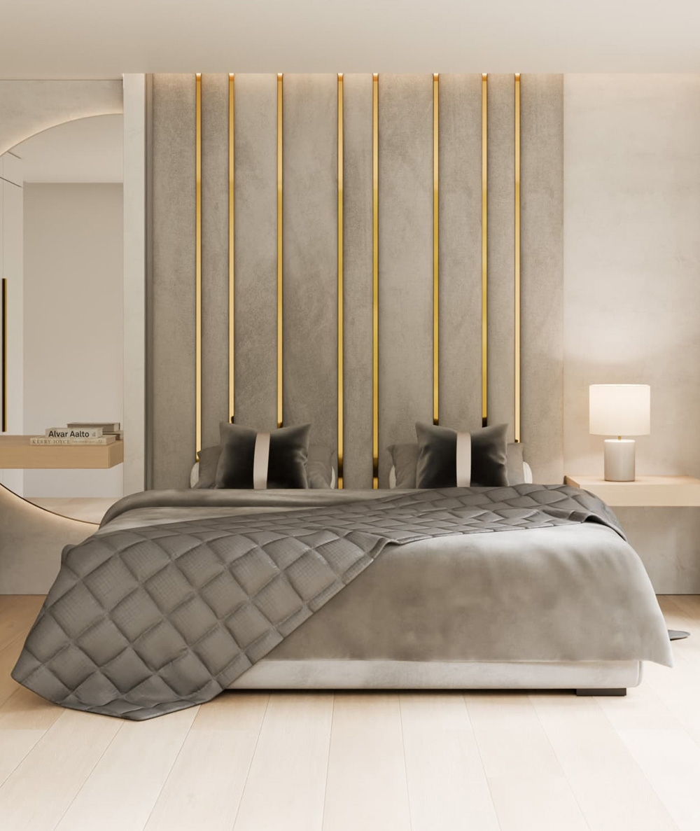 Prin combinarea cu lumini calde, finisajul aurit periat creează contraste spectaculoase și pune în valoare texturile naturale ale lemnului, pietrei sau marmurei.
