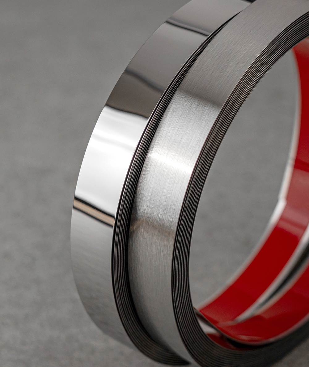 O bandă din oțel inoxidabil nichelat cu finisaj satinat argintiu, destinată decorării pereților, mobilierului și oglinzilor. Este autoadezivă și are o rezistență ridicată la apă și zgârieturi.