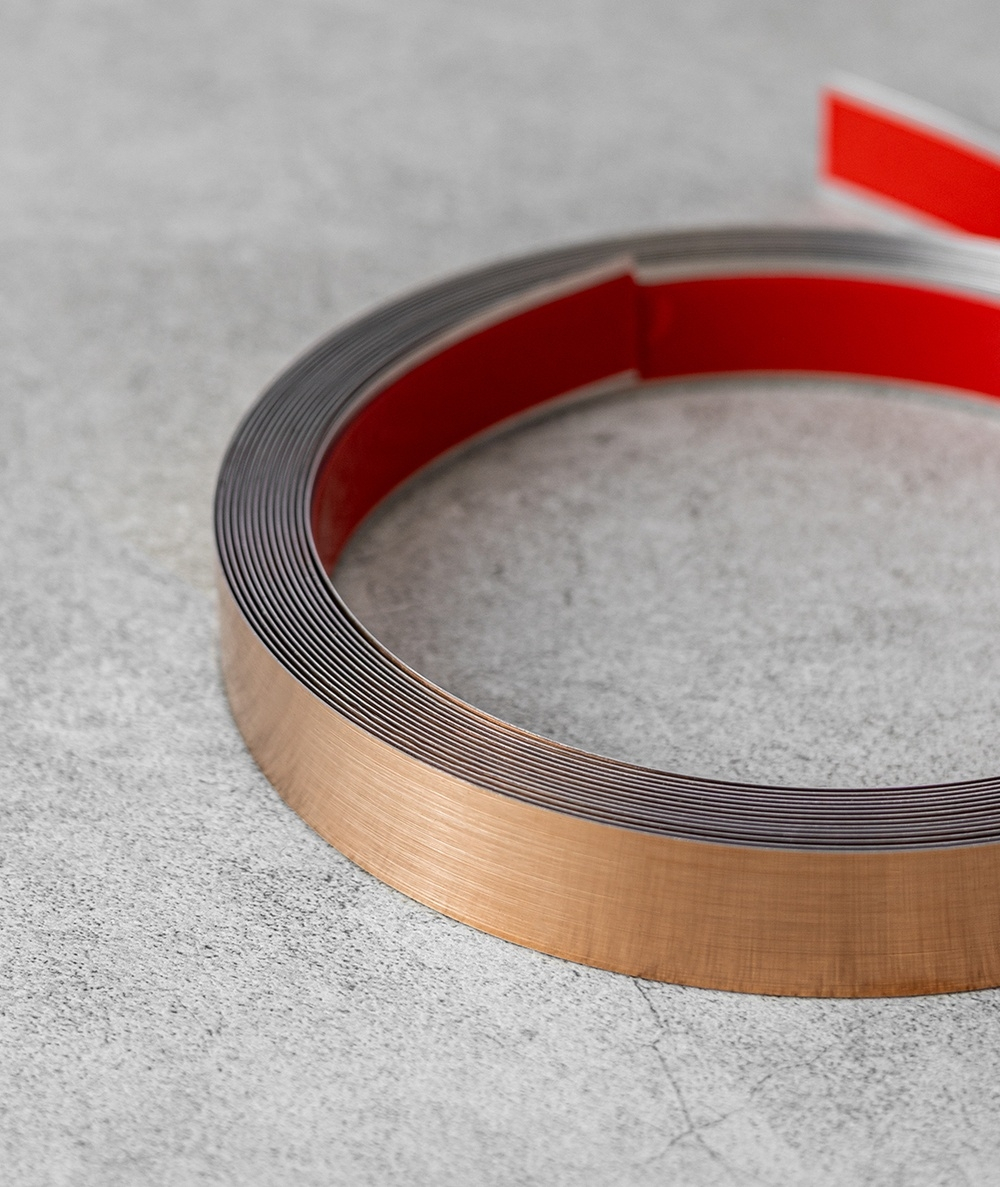 Este o bandă autoadezivă din inox nichelat cu finisaj bronz periat (rose gold), folosită pentru decor elegant și cald.