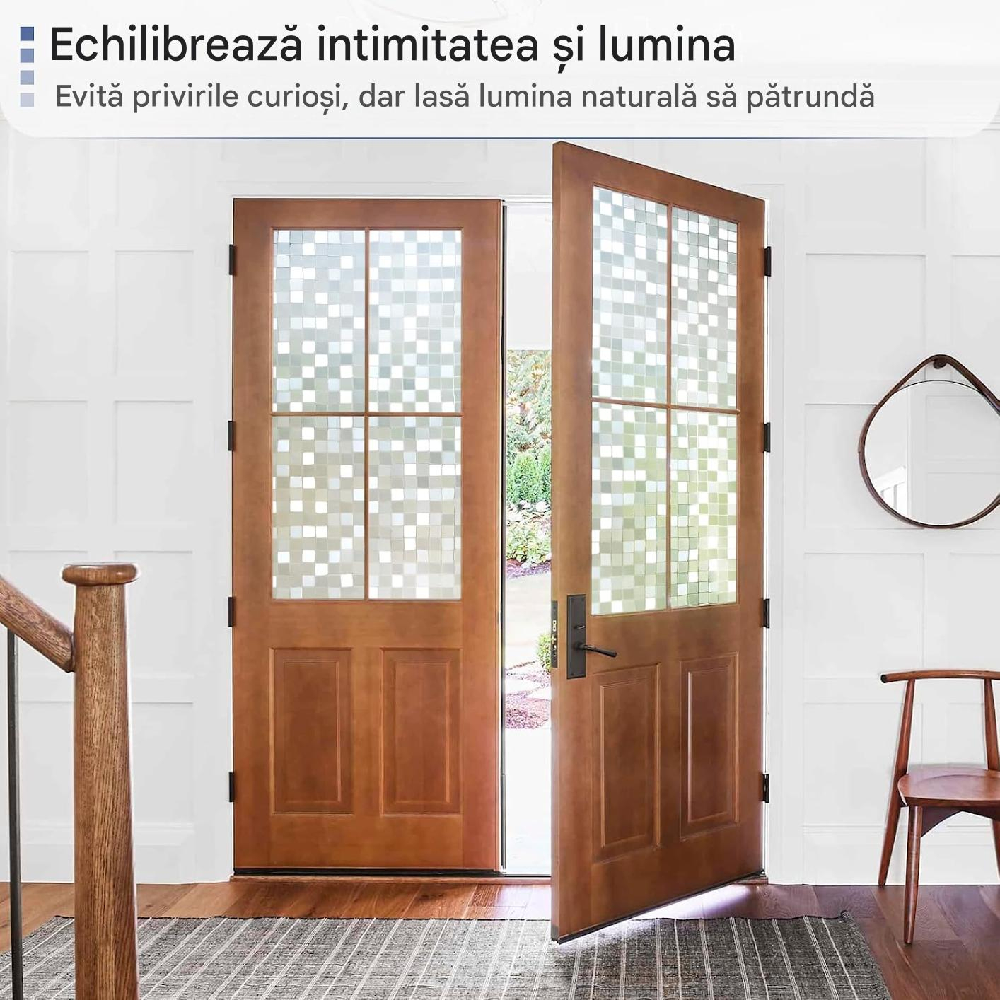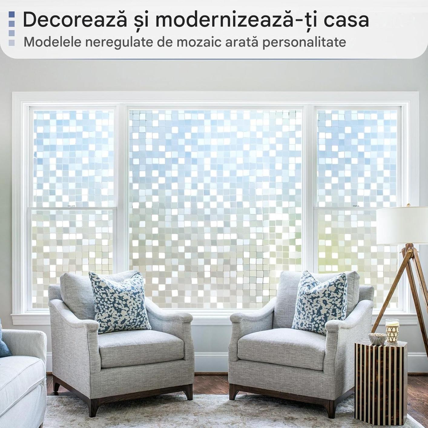 Folia electrostatică MaffStuff cu model mozaic sablat oferă intimitate pe geamuri, fără adeziv, lăsând lumina naturală să pătrundă în încăpere.